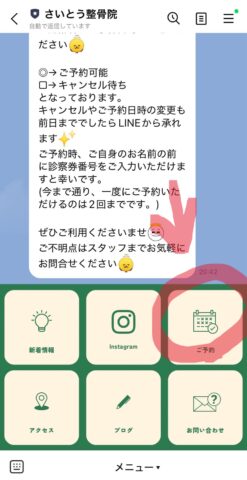 2.画面の下に表示されているリッチメニューの「予約」をタップ