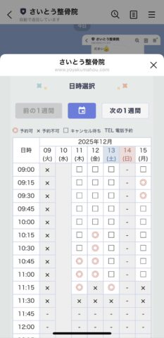 5.日時を選択(◎→予約可能 ▢→現在は予約満。キャンセルが出た時、LINEに連絡来ますので再度予約)